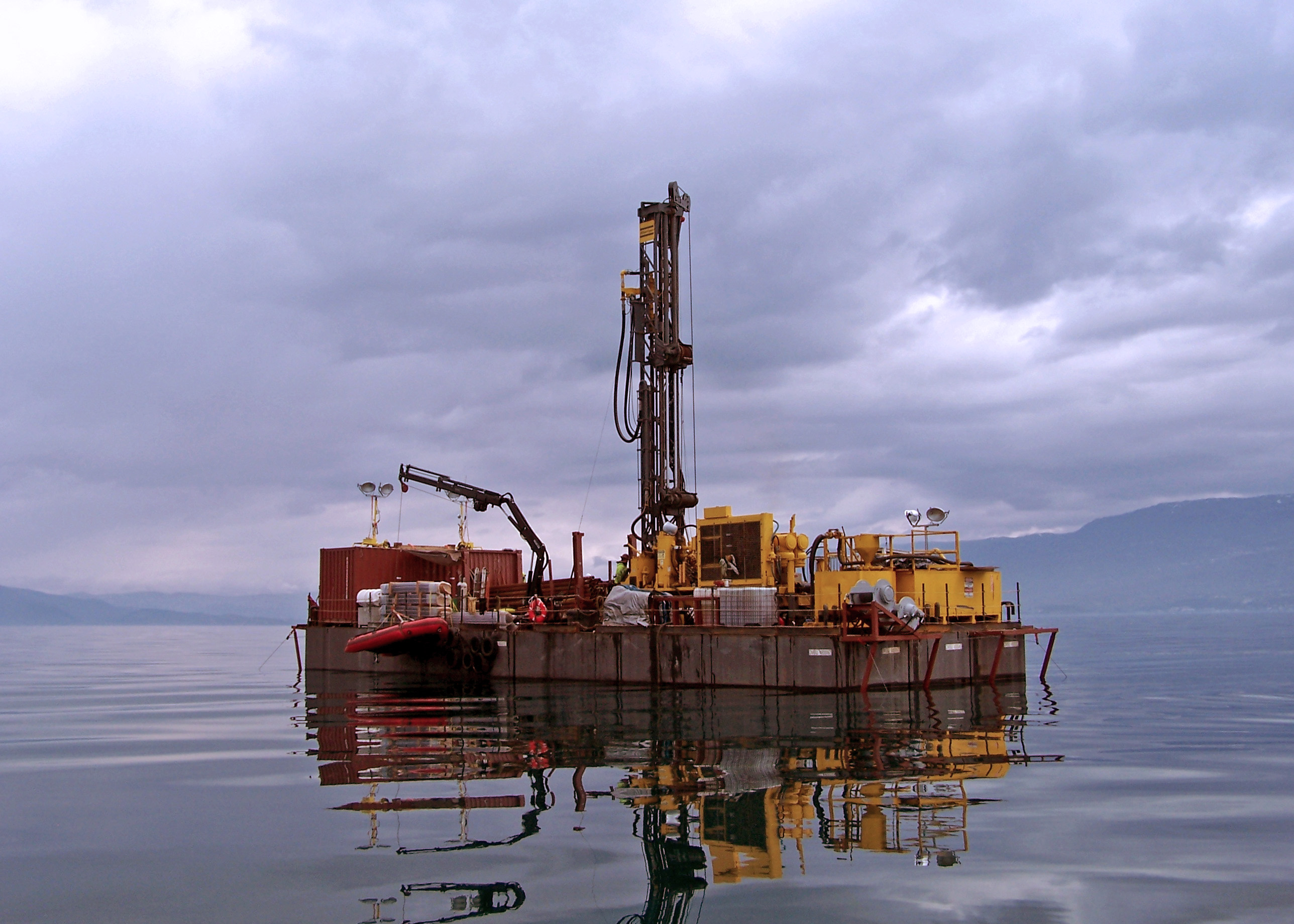 Mehrere Wochen lag die Bohrplattform auf dem Ohridsee, auf der ein internationales Forschungsteam verschiedene Bohrungen und Messungen durchführten. Quelle: LIAG/T.Grelle (idw)