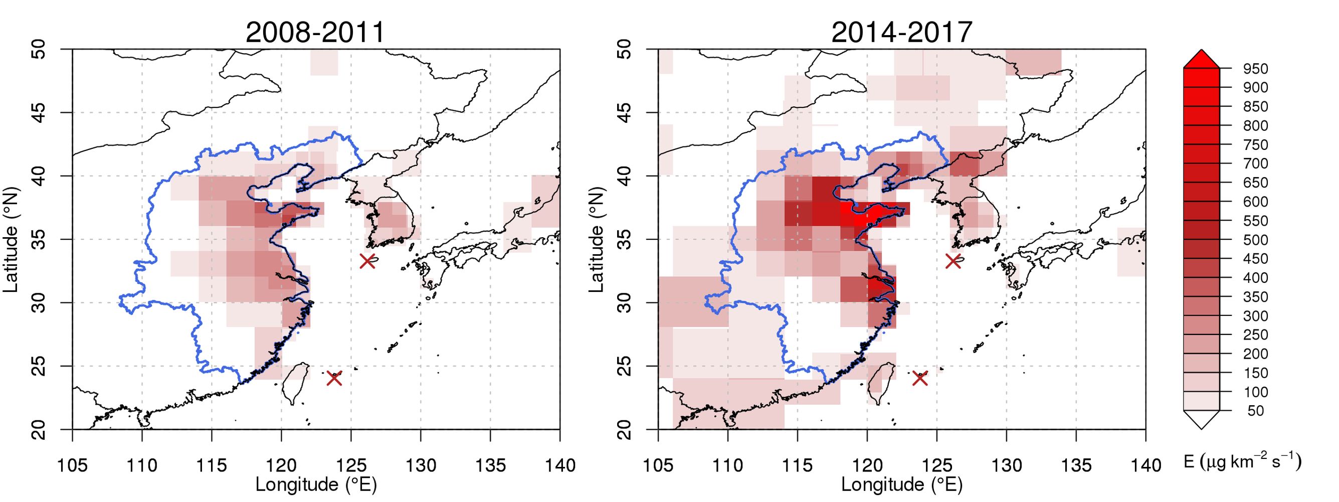 Regionale FCKW-11-Emissionen in Ostasien für die Jahre 2008-2011 und 2014-2017, wie sie aus Beobachtungen an den Messstationen Gosan und Hateruma (rote Kreuze). Quelle: Empa (idw)