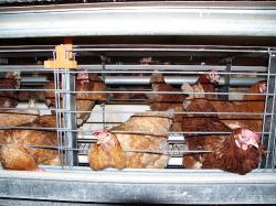Auch bei gleichmäßiger Verteilung geht es im ausgestalteten Großgruppen-Käfig beengt zu. Der Gitterboden ist tierfeindlich, weil er Fußballenentzündungen verursacht. Zur Verhinderung von Kannibalismus erhalten die Hennen nur Dämmerlicht.