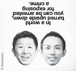 Die Tokyo Two: die beiden angeklagten Greenpeace-Aktivisten Junichi Sato und Toru Suzuki. "In einer Welt, die auf dem Kopf steht, kann verhaftet werden, wer ein Verbrechen aufdeckt." Bild: Greenpeace