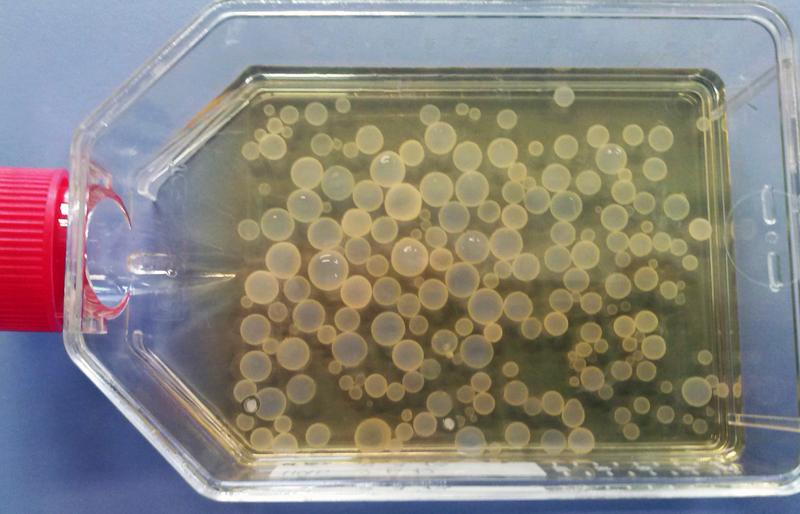 Fuchsbandwurm in Laborhaltung: Kultiviert werden die bläschenförmigen Larvenstadien, die in der Leber der Zwischenwirte wie ein Tumor wachsen. Dieses System wurde an der Uni Würzburg entwickelt. Mit ihm lässt sich unter anderem testen, welche Medikamente den Parasiten töten. Quelle: (Foto: Klaus Brehm) (idw)