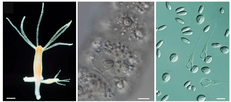 Süßwasserpolyp Hydra. Tier mit Fangarmen (Tentakeln) und Knospen (links); Tentakel mit Nesselzellen in Batteriezellen eines Tentakels (Mitte); isolierte z. T. entladene Nesselkapseln (rechts) Quelle: Fotos: Nüchter und Holstein (links), Holstein (Mitte und rechts), Molekulare Evolution & Genomik, COS Heidelberg (idw)