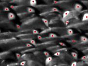 Um Bewegungsprofile der einzelnen Pinguine zu erhalten, wurden die hellen Seitenflecken am Kopf der Tiere mit einem Bildverarbeitungs-Algorithmus gefunden (rote Markierungen) und zeitlich verfolgt.