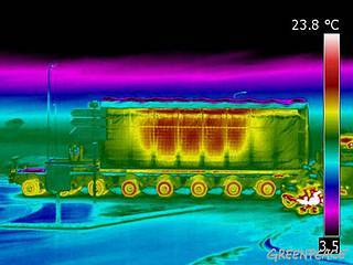 Thermografiebild. Die Aufnahme zeigt die Wärmeentwicklung an der Außenseite der Castorbehälter. Bild: Greenpeace