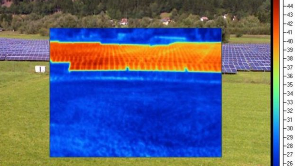 Im Sommer kann man mit Hilfe einer Wärmebildkamera erkennen, dass die PV-Module wesentlich wärmer sind, als die benachbarten Grasflächen / Bild: energiedetektiv.com