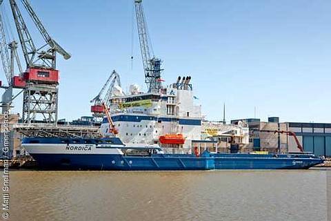 Das Shell Spezialschiff Nordica im Hafen von Helsinki. Bild: Matti Snellman / Greenpeace