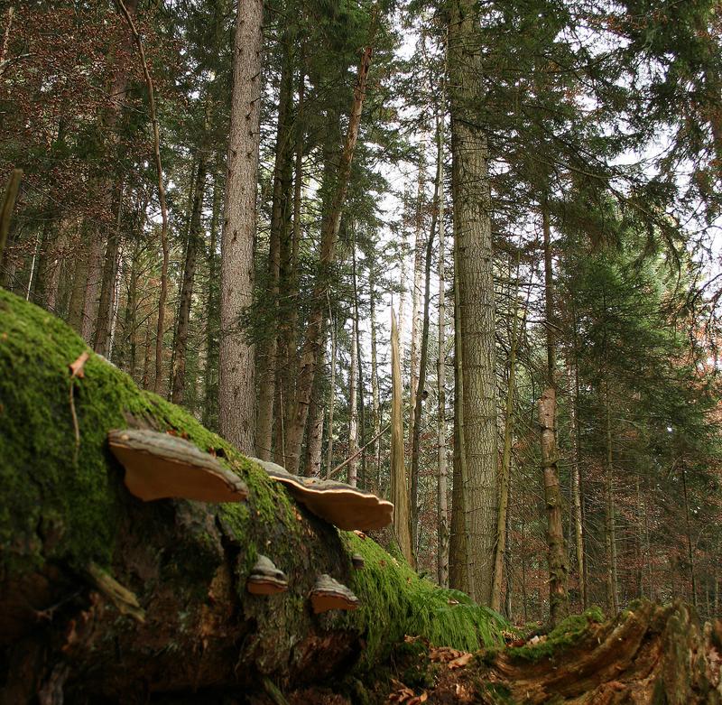In Waldreservaten - hier Leihubelwald - gibt es sehr viel totes Holz. An liegenden Stämmen wachsen grosse Konsolenpilze. Quelle: Reinhard Lässig (WSL) (idw)