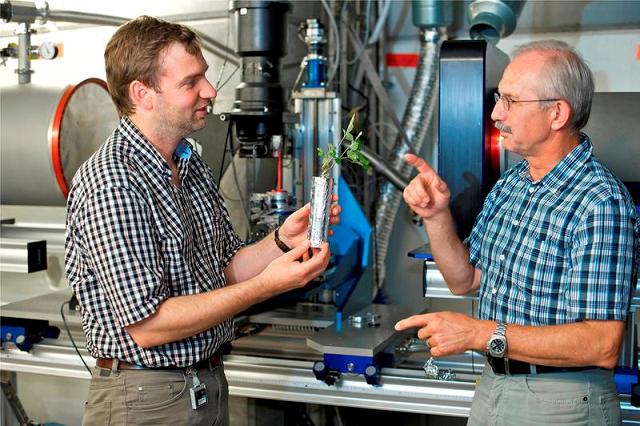 Am Schweizer Paul Scherrer Institut können in einer hochmodernen Anlage zur Tomografie mit Neutronen Untersuchungen an lebenden Pflanzen vorgenommen werden. Hier Prof. Dr. Sascha Oswald von der Universität Potsdam (links) im Gespräch mit Anlagenleiter Dr. Eberhard Lehmann. Bild: PSI/M.Fischer