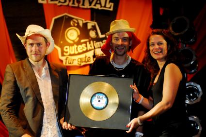 Siegesfeier auf dem ersten klimafreundlichen Musikfestival. v.l.n.r. Mellow Mark und Pyro Merz werden von Tanja Loitz, Kampagnenleiterin "Klima sucht Schutz" ausgezeichnet. Bild: obs/co2online gGmbH