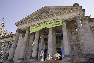Greenpeace-Banner oben am Reichstag in Berlin. Unter der Inschrift "Dem deutschen Volke" steht jetzt "... eine Zukunft ohne Atomkraft". Bild: Greenpeace