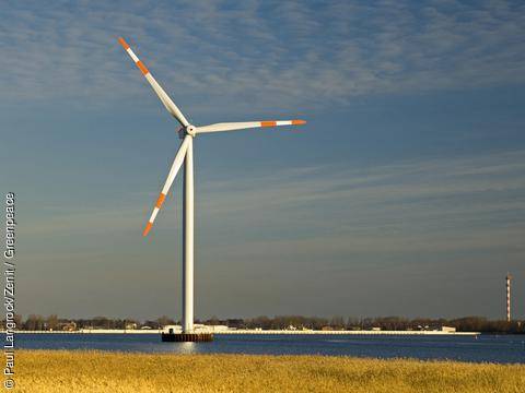 Im Rostocker Hafen hat der deutsche Windkraftanlagenbauer Nordex die Windkraftanlage N90 2500 mit 2,5 Megawatt MW Leistung, Rotorblattlaenge 45 m, Nabenhoehe 80 m errichtet. Mit der N90 an diesem Standort werden Bedingungen getestet, wie sie auch auf dem Meer offshore herrschen. Mindestens 10 Anlagen diesen Typs sollen ab 2007 in Deutschlands erstem Offshorewindpark Baltic I circa 20 km vor der Ostsee Halbinsel Darss zusammen mit anderen Windraedern 54 Megawatt Strom erzeugen. Bild: Paul Langrock/Zenit / Greenpeace