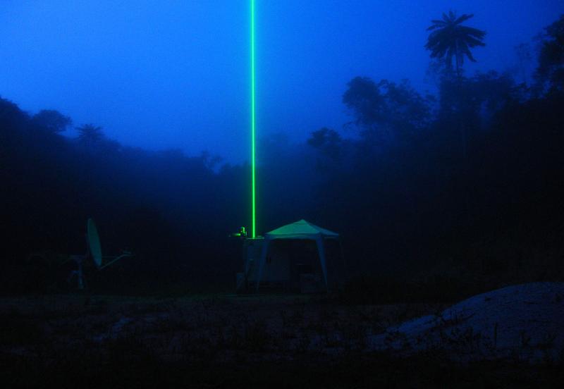 LIDAR-Messung in brasilianischen Regenwald bei Nacht. Zu sehen sind die in die Atmosphäre ausgesendeten grünen Laserpulse mit einer Wellenlänge von 532 Nanometern. Quelle: Foto: Holger Baars/IfT (idw)
