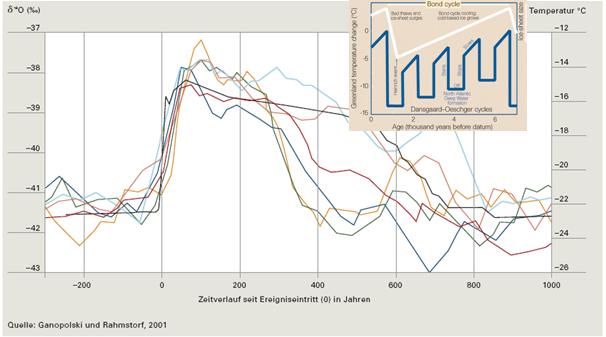 Die Abbildung 2 zeigt den typischen Temperaturverlauf einiger DO-Ereignisse. Sie beginnen mit einer abrupten Erwärmungsphase, halten ihre Temperatur, um anschließend wieder rapide zu fallen. Grafik: EIKE