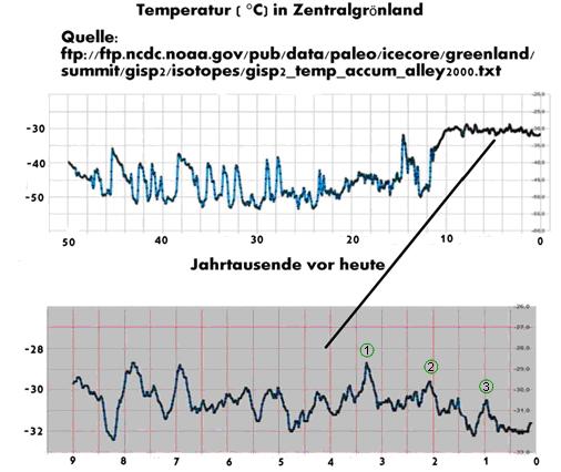 Das GISP-2 ermittelte Temperaturprofil von 50.000 BP bis heute und darunter, als Feinauflösung von 7.000 v.Chr. bis heute. Unschwer ist zu erkennen, dass wir, zumindest nach den Untersuchungen von Rahmstorf, heute in einer vergleichweise kalten Zeit leben. Während der mittelalterlichen Warmzeit vor 1.000 Jahren, als die Wikinger das grüne Grönland (daher der Name: Grünland) besiedelten und dort Ackerbau und Viehzucht betreiben konnten, war es ca. 1°C wärmer als heute. Im römischen Klimaoptimum vor ca. 2.000 Jahren, als Hannibal mit seinen Elefanten im Winter! die weitgehend gletscherfreien Alpen überquerte, war es sogar rund 2°C wärmer als heute und im Klimaoptimum des Holozäns vor fast 3.500 Jahren, als sich die Hochkulturen entwickelten, war es sogar ca. 3°C wärmer als heute. Im Anschluss daran gab es vor ca. 3.200 Jahren eine rapide Abkühlung von etwa 2°C.