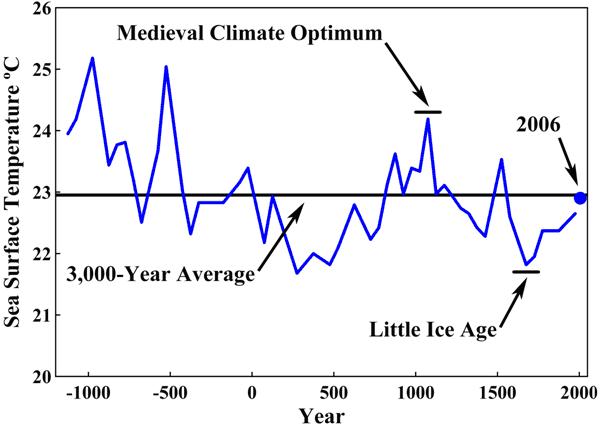 Oberflächentemperatur in der Sargasso-See über die letzten 3.000 Jahre. Auch hier ist deutlich zu sehen, dass die heutigen Temperaturen vergleichsweise niedrig sind. Bild: http://www.oism.org/pproject/s33p36.htm