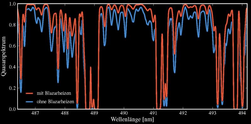 Simulierter Linienwald eines Quasarspektrums. Das blaue Spektrum stellt ein Universum ohne Blazarheizen dar, das rote ein Universum mit Blazarheizen. Deutlich ist, dass der zusätzliche Heizprozess neutralen Wasserstoff ionisiert und damit weniger UV-Licht eines Quasars absorbiert wird. Quelle: Grafik: HITS (idw)