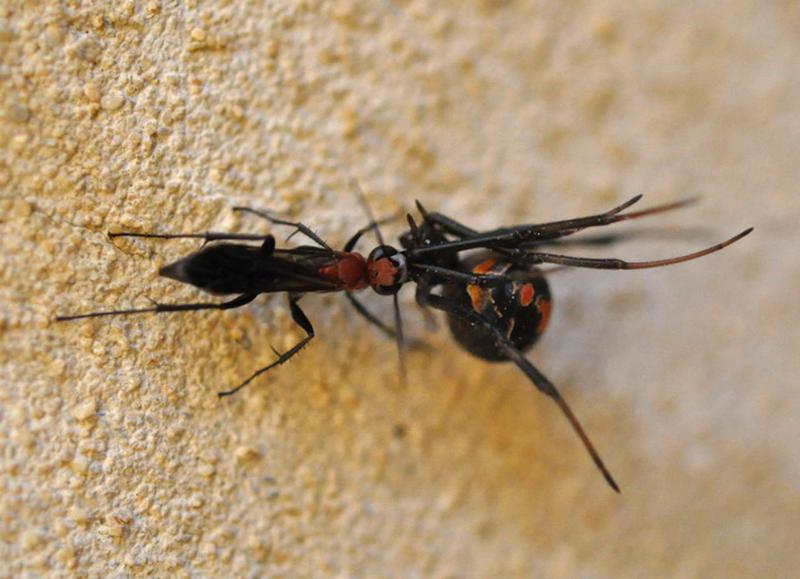 Agenioideus nigricornis (Hymenoptera: Pompilidae) erbeutet eine Rotrückenspinne (Latrodectus hasselti). Quelle: Foto: Florian und Peter Irwin. (idw)