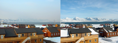 Dunst über Spitzbergen. Links (2. Mai 2006) ist deutlich die Verfärbung der unteren Atmosphäre zu erkennen. Am 8. Mai (rechts) ist die verschmutzte Luftschicht verschwunden. Foto: Jürgen Graeser/ Alfred-Wegener-Institut
