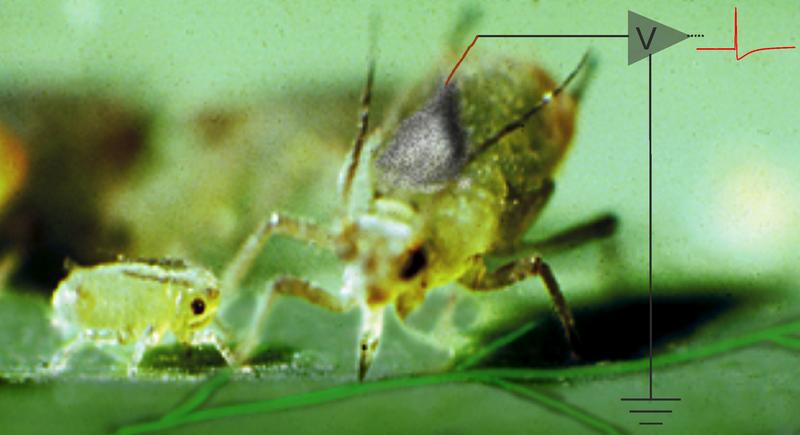 Blattläuse stechen zielgenau in die Siebröhren der Pflanzen. Mit ihnen als Bio-Elektroden lassen sic Quelle: (Bild: Jörg Fromm / Christian Wiese) (idw)