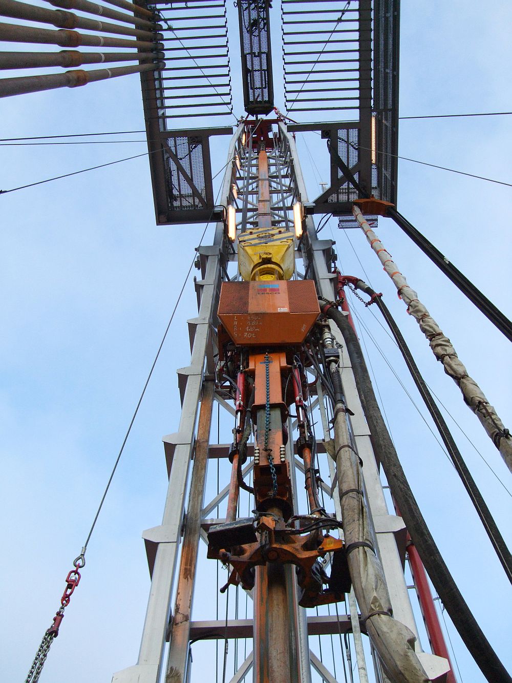 Kraftdrehkopf mit Schlauchzuleitung am Bohrgestänge einer Erdölbohranlage