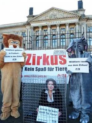 „Ilse Aigner“ im Zirkuskäfig: PETA-Aktion vor dem Bundesrat / November 2011. Bild: PETA