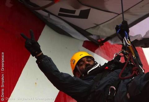 Kumi Naidoo, Geschäftsführer von Greenpeace International, protestiert mit fünf weiteren Greenpeace-Aktivisten an der Gazprom-Ölplattform Prirazlomnaya in der Petschorasee in Russland. Bild: Denis Sinyakov / Greenpeace