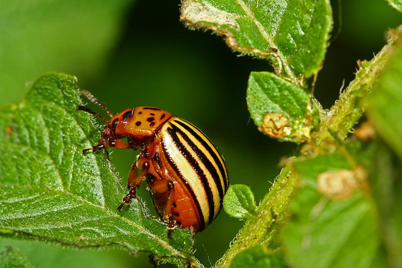 Kartoffelkäfer (Leptinotarsa decemlineata). Der ursprünglich aus Amerika kommende Kartoffelkäfer ist ein Schadinsekt und ernährt sich von der Kartoffelpflanze. Innerhalb kurzer Zeit kann er Felder kahl fressen und Ernten vernichten. Quelle: Foto: Fotolia.com - © Jürgen Hust (idw)