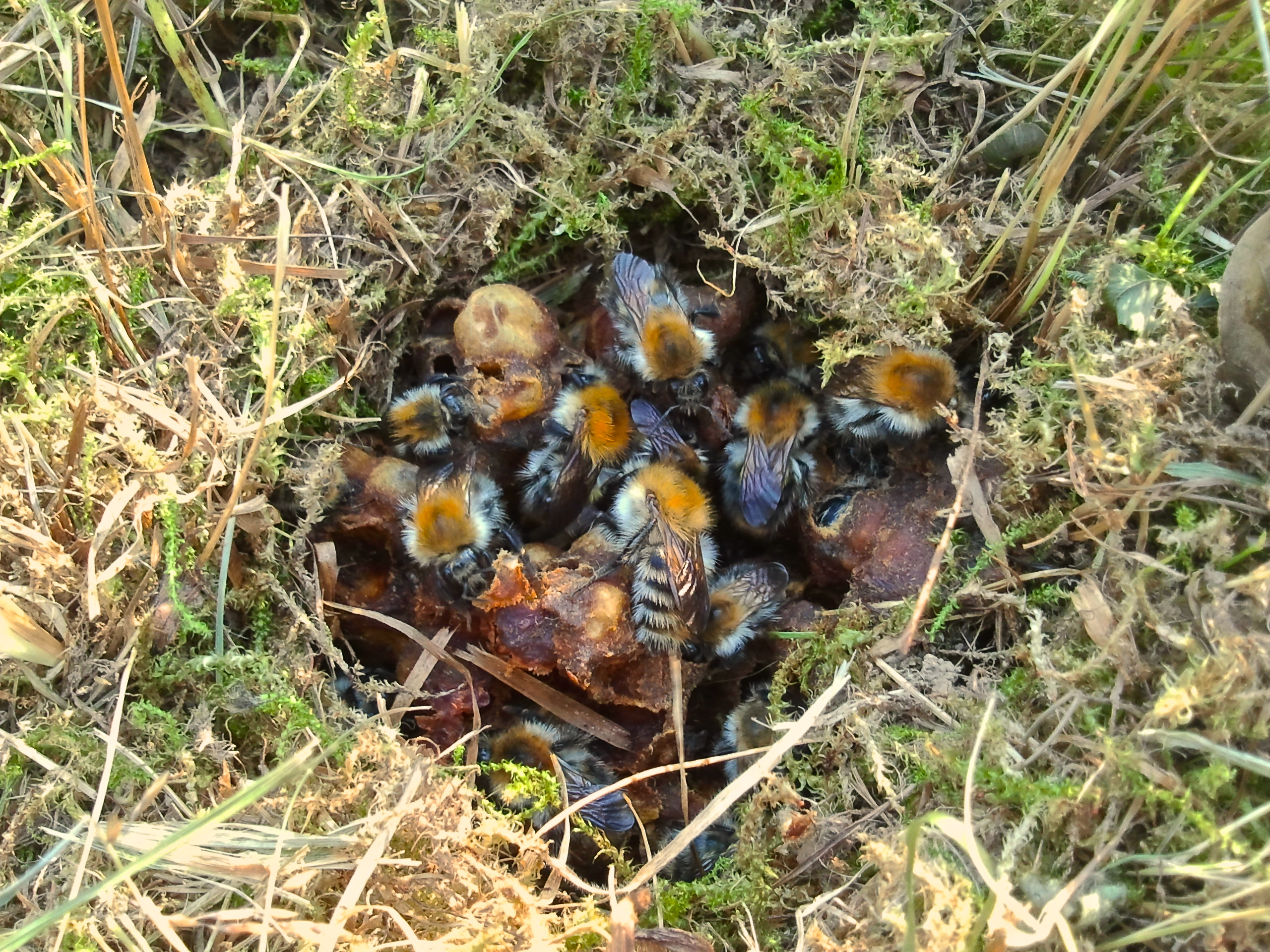 Oberirdisches Ackerhummel-Nest (obere Wachsabdeckung der Nestkugel wurde entfernt)