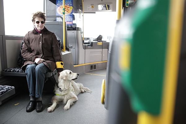 Führhundhalterin mit Golden Retriever im Bus. Bild: Friese