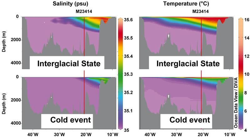 Salzgehalt und Temperatur entlang des Schnittes durch den Nordatlantik für Interglazial und Kaltzeit. Quelle: Grafik: E. Kandiano. (idw)