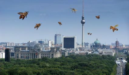 Honigbienen vor der Berliner Skyline (Fotomontage). Bild: "obs/Zentrum der Umweltkommunikation der Deutschen Bundesstiftung Umwelt ZUK/Deutschland summt!"