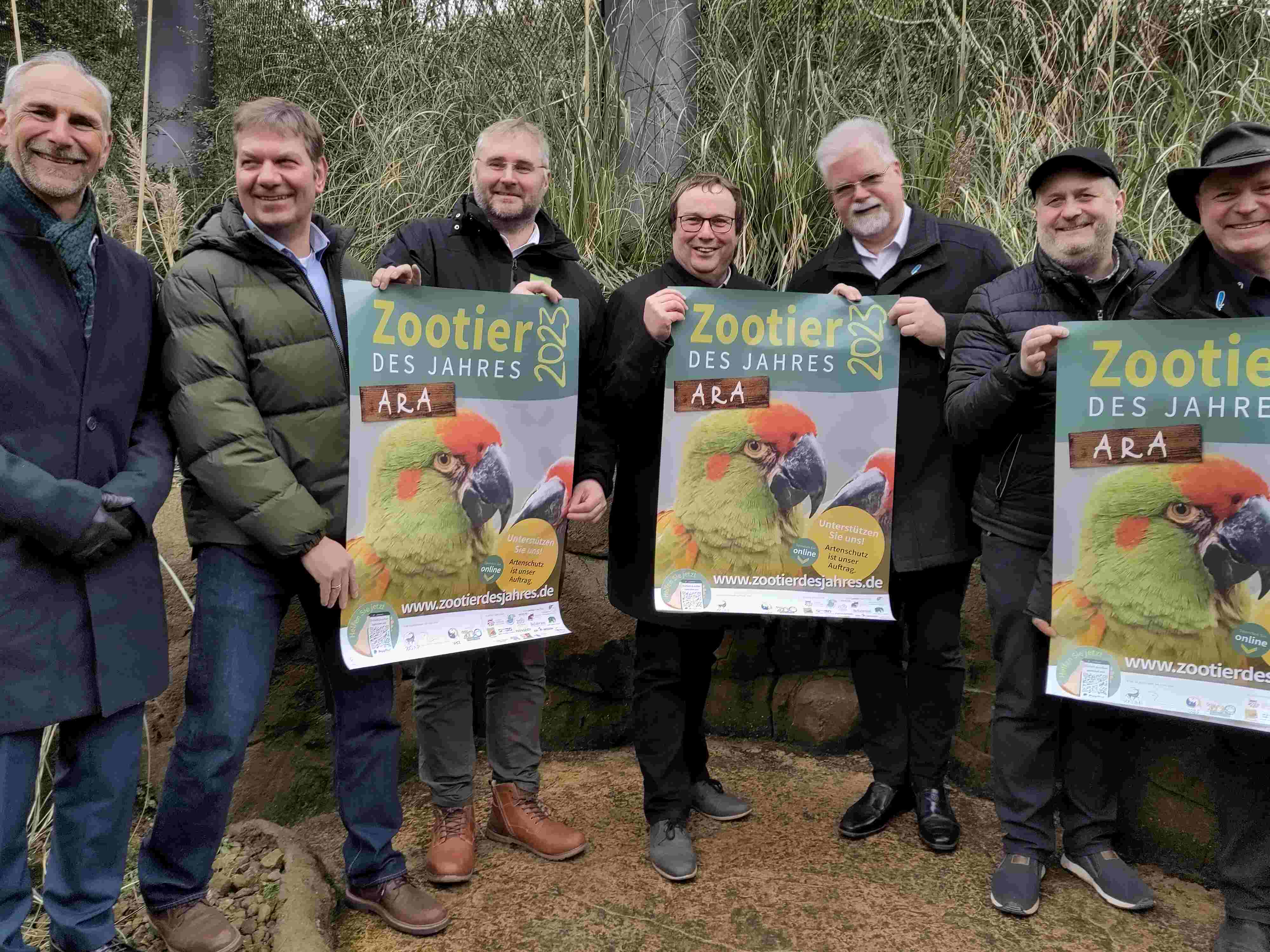 Vorstellung des Zootier des Jahres 2023: Der Ara. Mit Dr. Arne Lawrenz (Direktor Grüner Zoo Wuppertal, Volker Homes (Verband der Zoologischen Gärten), Dr. Nils Kramer (Vorstand DTG, Direktor Tierpark Nordhorn), Oliver Krisc318 / Die Verwendungher (Minister für Umwelt, Naturschutz und Verkehr des Landes Nordrhein-Westfalen), Bruno Hensel (Präsident der GdZ, 1. Vorsitzender Zoo-Verein Wuppertal, Dr. Jens-Owe Heckel (Vorsitzender ZGAP, Direktor Zoo Landau), Dr. Seven Hammer (ZGAP-Vorstandsmitglied)