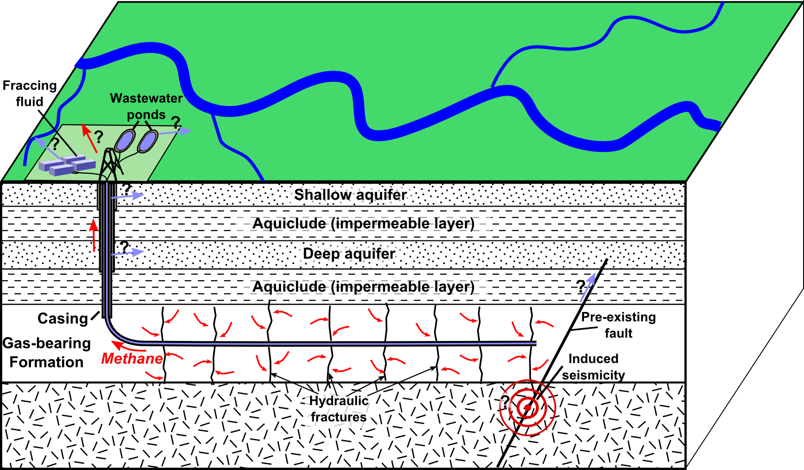Fracking: Schematische Darstellung einer Bohrung mit potentiellen Risiken für die Umwelt
