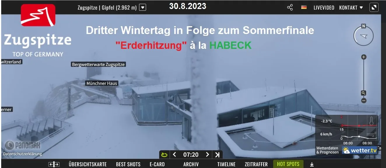 Am 30.8.2023 gibt es auf der Zugspitze den dritten Wintertag in Folge zum Sommerfinale 2023. Die aktuelle Schneehöhe beträgt 12cm. Ein weiteres sicheres Zeichen der „Erderhitzung“ à la HABECK… Bild: Zugspitze Panorama-Webcam / wobleibtdieglobaleerwaermung.wordpress.com