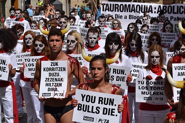 Aktion von PETA UK und AnimaNaturalis gegen die Stierhatz und Stierkampf in Pamplona. Bild: PETA UK