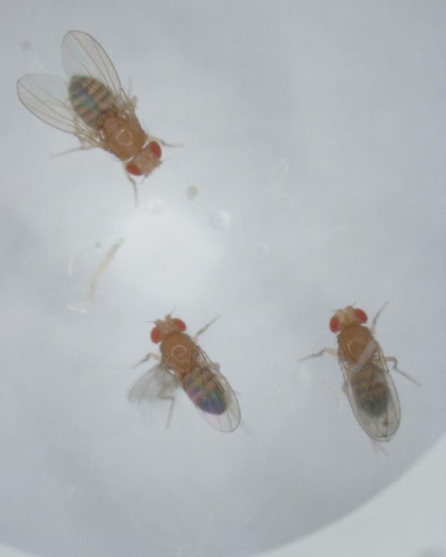 Ein Fruchtfliegen-Weibchen (links oben) vor der Wahl: Welches der beiden Männchen ist attraktiver? Quelle: Foto: Joanne Yew / Jacqueline Chin (idw)