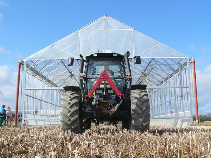 David und Goliath: Ein Schlepper zieht das 24 Tonnen schwere Regendach. Quelle: (c) Foto: Uni Bonn (idw)
