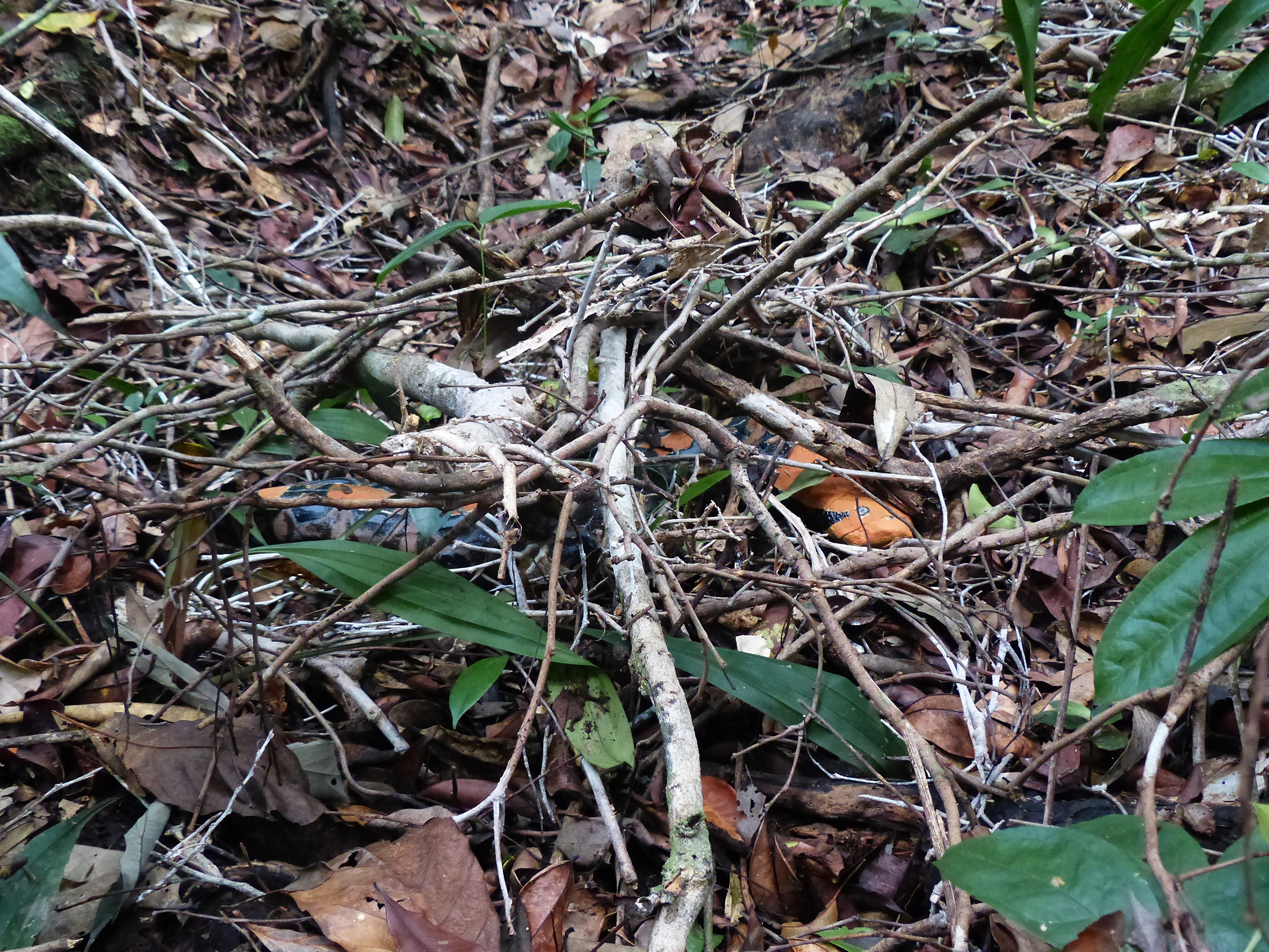 Die Forscher versteckten ein Schlangenmodell (orange) im Wald und filmten die Reaktionen der Affen, die es sichteten.