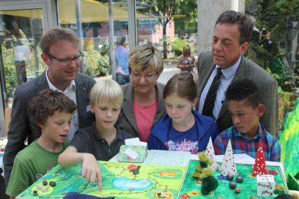 Auszeichnung des UN-Dekade-Projektes "Wölfen auf der Spur" (v.l.n.r.): Frank Corleis, Leiter des SCHUBZ Lüneburg, Frauke Heiligenstadt, Niedersächsische Kultusministerin und Schirmherrin des Ideenwettbewerbs und Helmut Dammann-Tamke, Präsident der Landesjägerschaft Niedersachsen e.V., lassen sich einen Projektbeitrag erklären. Bild: "obs/Zentrum für Umweltkommunikation der Deutschen Bundesstiftung Umwelt ZUK/Landesjägerschaft Niedersachsen"