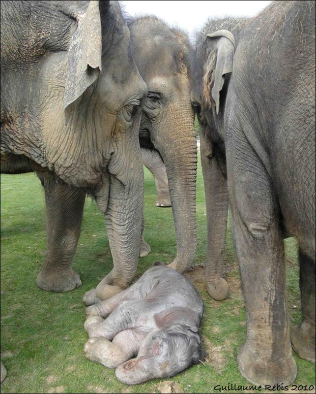 Schlafendes neugeborenes Asiatisches Elefantenbaby bewacht von Mutter und Tanten. Das hohe Kompetenzlevel bei der Geburt und die enorme Fürsorge der Herde tragen zur hohen Überlebensrate von Elefantenkälbern bei. Quelle: Foto: Guillaume Rebis (idw)