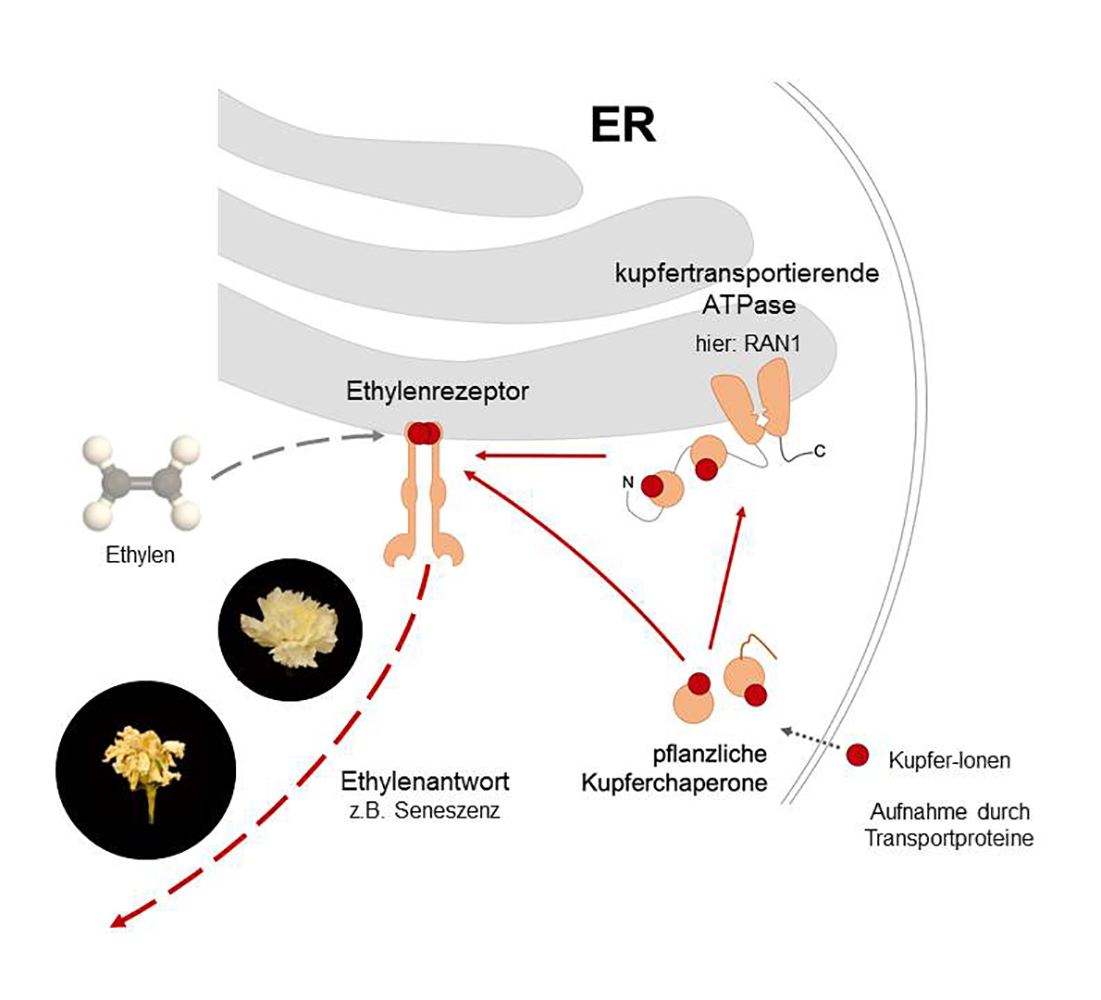Kupfer-Ionen gelangen mit Hilfe von Transportproteinen zu den Ethylenrezeptoren am Endoplasmatischen Retikulum. Dort lösen sie verschiedene Reifesignale für die Pflanze aus, bis hin zum Verwelken.