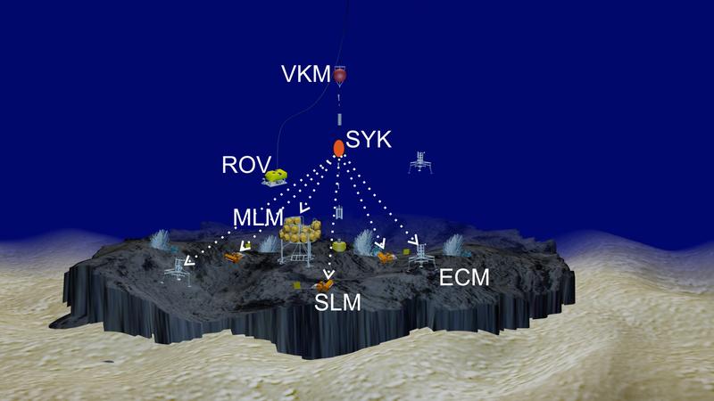 Die Basiskonfiguration des MoLab Messfeldes besteht aus: einem Master Lander (MLM), drei Satelliten Landen (SLM), drei Eddy Correlation Modulen (ECM) und zwei Verankerungsmodulen (VKM). Für die notwendige detaillierte Messfelderkundung, die Modulinstallation sowie dem Modulservice wird das ROV Phoca (E) eingesetzt. Die durchbrochenen Linien deuten die Verbindung der einzelnen Lander zu dem zentralen Synchronisationsmodul über akustische Unterwassertelemetrie an. Quelle: Grafik: MoLab-AG, GEOMAR (idw)