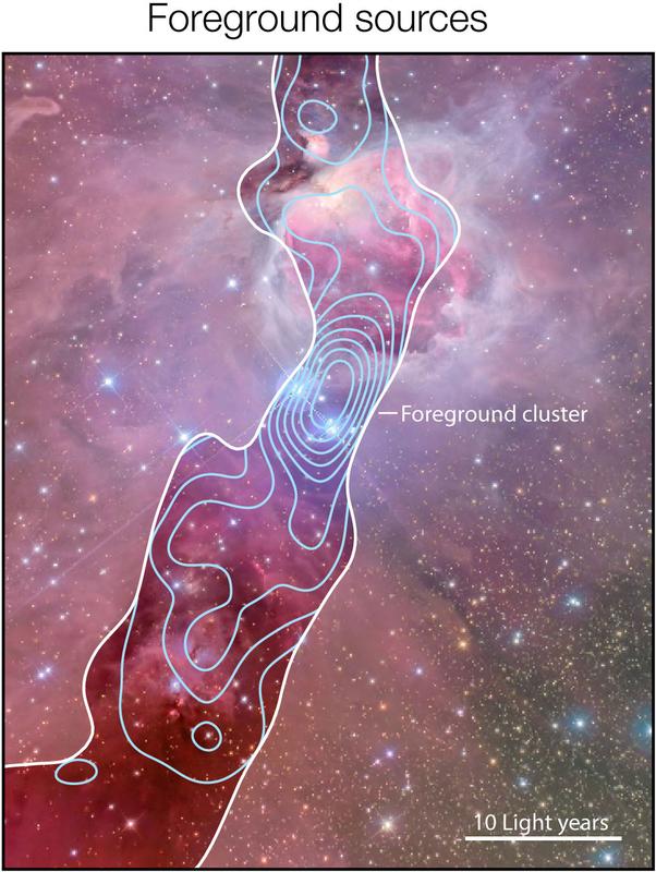 Räumliche Verteilung der Sterne vor dem Hintergrund des Orionnebels. Im Zentrum der elongierten blauen Linien erreicht die Sterndichte ihr Maximum. Dort liegt das Zentrum des im Text erwähnten zweiten Sternhaufens, dessen Masse deutlich nach oben korrigiert werden musste. Quelle: (Copyright: Alves & Bouy / EDP Sciences) (idw)