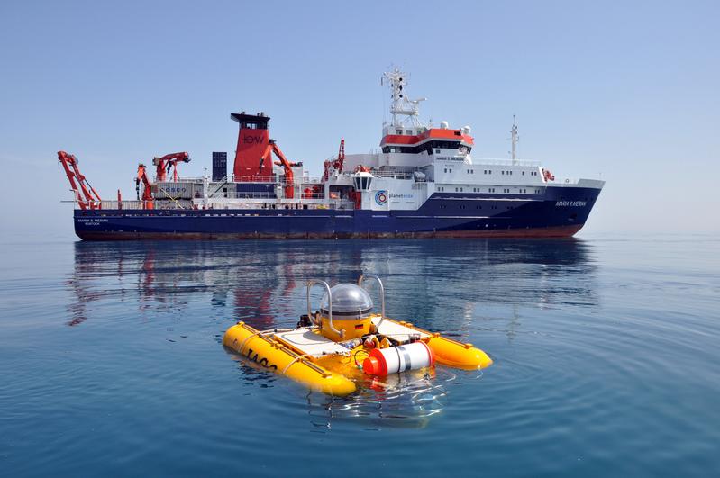 Ein bewährtes Team für die Meeresforschung: das Forschungsschiff MARIA S. MERIAN und Deutschlands einziges Forschungstauchboot JAGO. In den kommenden Wochen untersuchen Wissenschaftler aus Kiel mit ihnen Gasaustrittstellen vor der Westküste Spitzbergens. Quelle: Foto: JAGO-Team, GEOMAR (idw)