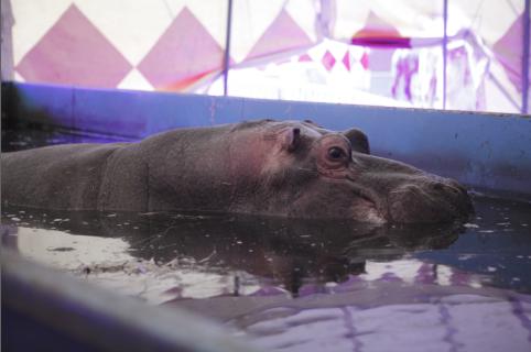 Das Flusspferd des Zirkus Voyage lief gestern durch Schwerin. Bild: VIER PFOTEN