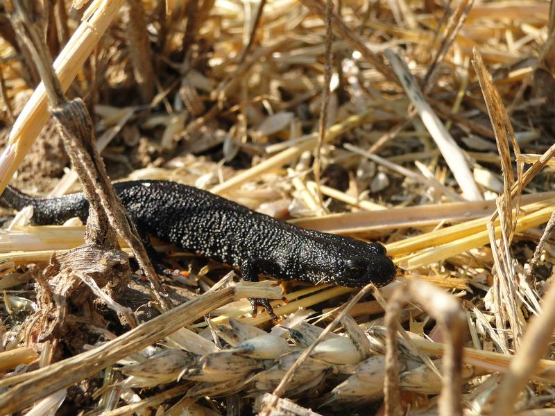 Amphibien durchkreuzen auf der Wanderung zu ihren Laichplätzen oft landwirtschaftlich genutzte Agrarflächen. Das Bild zeigt einen ausgewachsenen Kammolch (Triturus cristatus) in einem Stoppelfeld. Quelle: Foto: Kristin Meier, ZALF (idw)