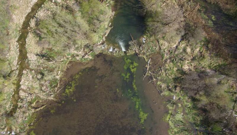 Luftaufnahme eines Biberdamms mit Staubereich im Bereich der Mündung der Dorfen in die Isar. Im flachen Gelände entstehen große Teiche. Quelle: Bild: Hochschule Weihenstephan-Triesdorf (idw)
