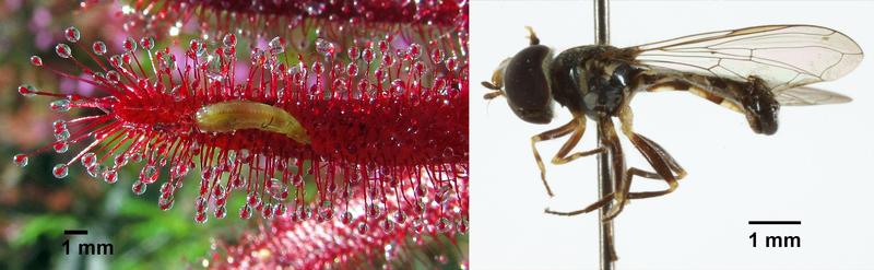 Links: Die Schwebfliege Toxomerus basalis. Links: Larve auf dem Blatt des fleischfressenden Sonnentaus Drosera graomogolensis in Minas Gerais, Brasilien. Rechts: Adultes Männchen. Quelle: Links:Paulo M. Gonella, University of São Paulo, SPF. Rechts: Jeff Skevington, Canadian National Collections, CNC (idw)