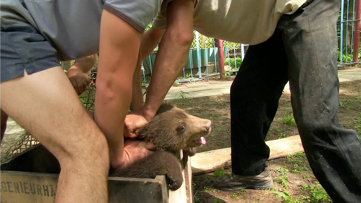 Babybärin Nastia wird von Tierhändlern in eine Transportbox gezwängt. Bild: VIER PFOTEN