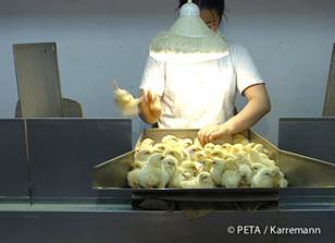 Leider männlich - Küken werden zum Schreddern aussortiert. Bild: © PETA / Karreman